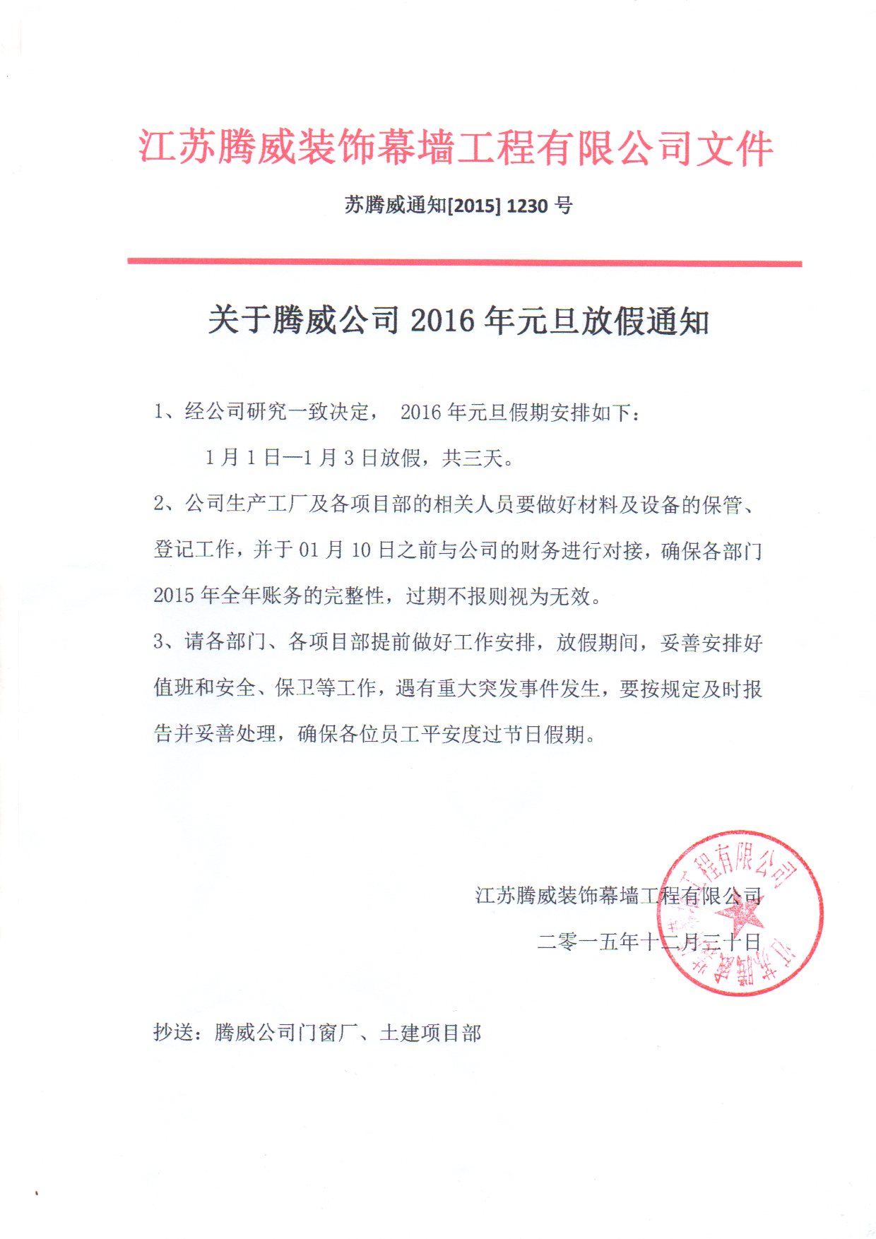 關于2016年元旦放假通知