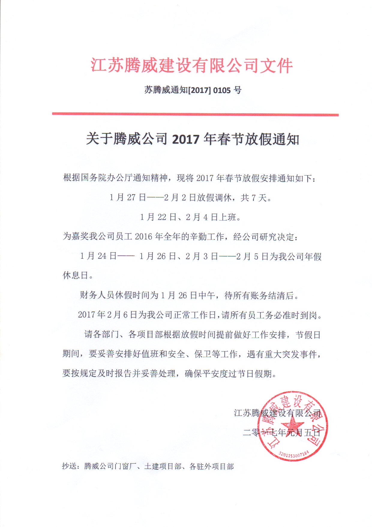 2017年春節放假通知