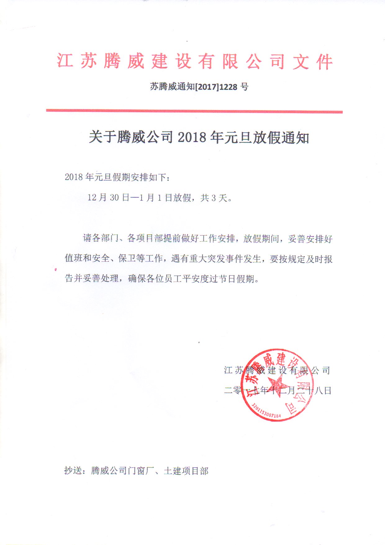 2018年元旦放假通知